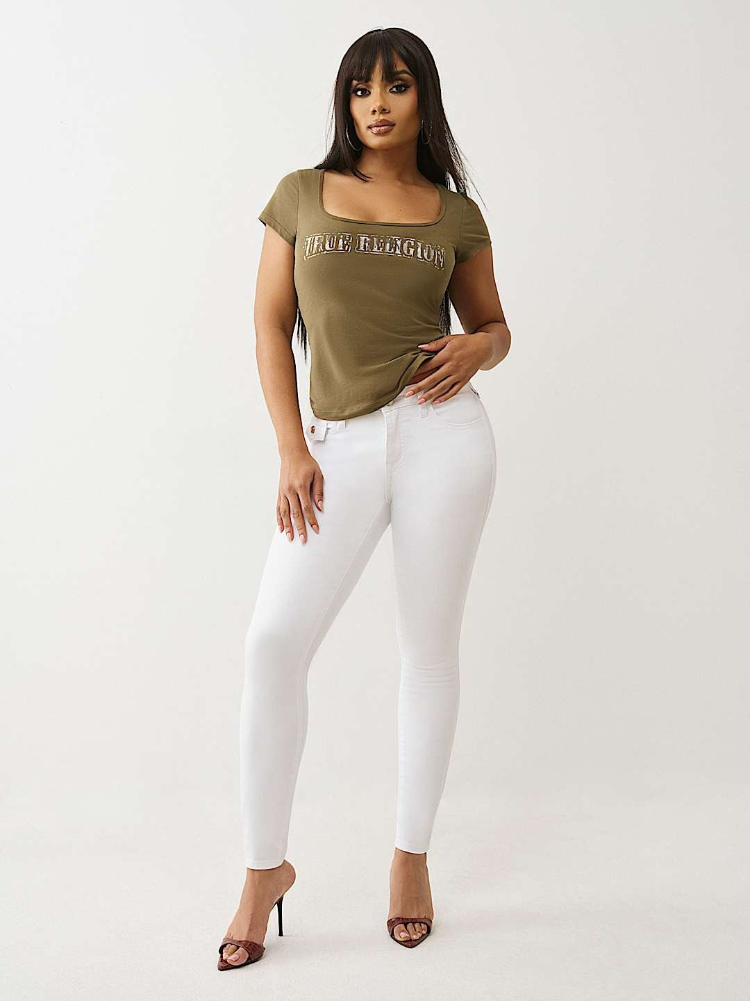 Elevate your denim collection with the True Religion Jennie Big T Lurex Skinny jeans in crisp Optic White. Featuring the iconic Big T back pocket design and shimmering lurex detailing, these jeans blend classic True Religion style with contemporary sparkle. The skinny silhouette offers a flattering, streamlined fit perfect for dressing up or down. Crafted with premium denim quality, these versatile whites pair effortlessly with everything from casual tees to elegant tops, making them an essential wardrobe staple.