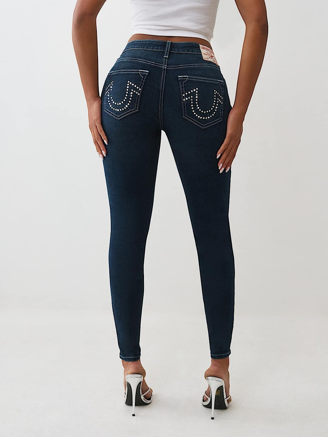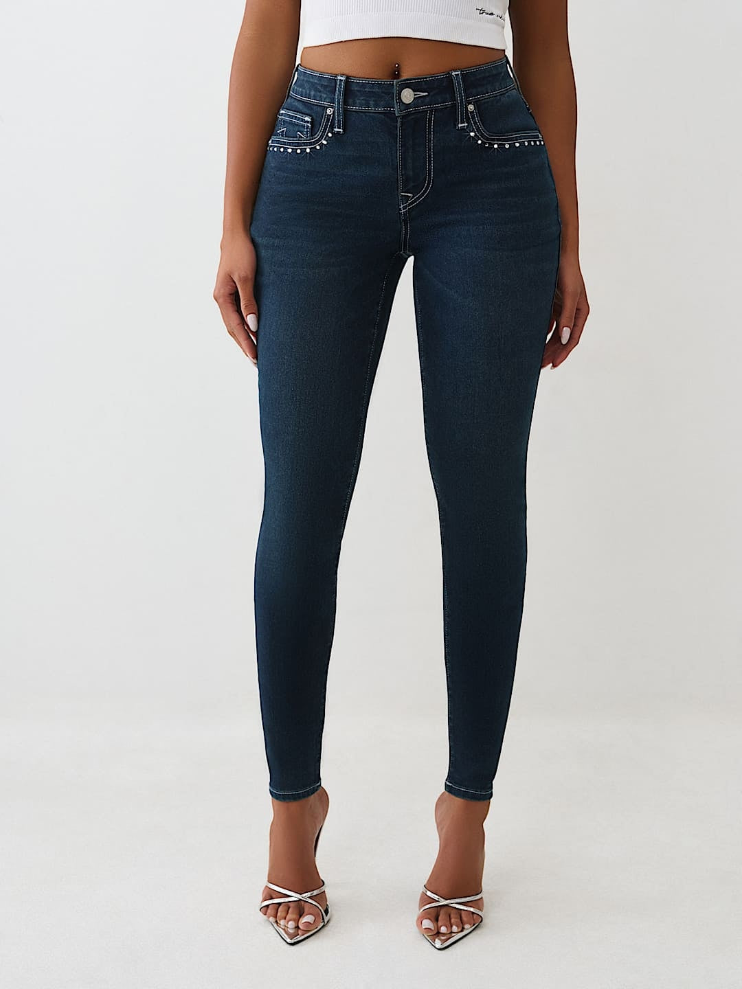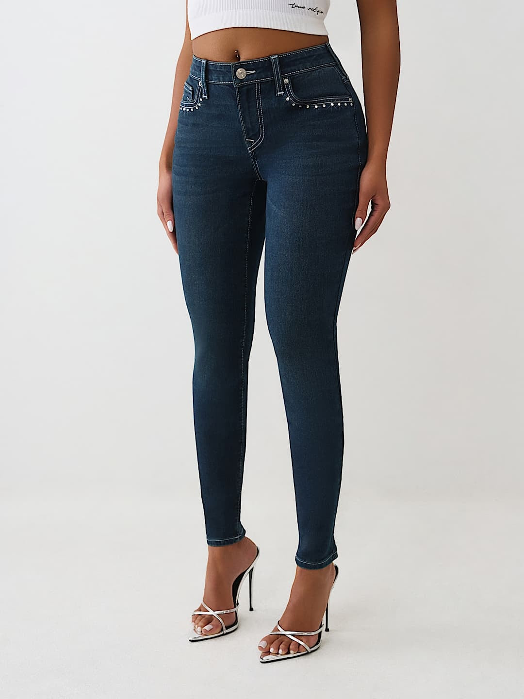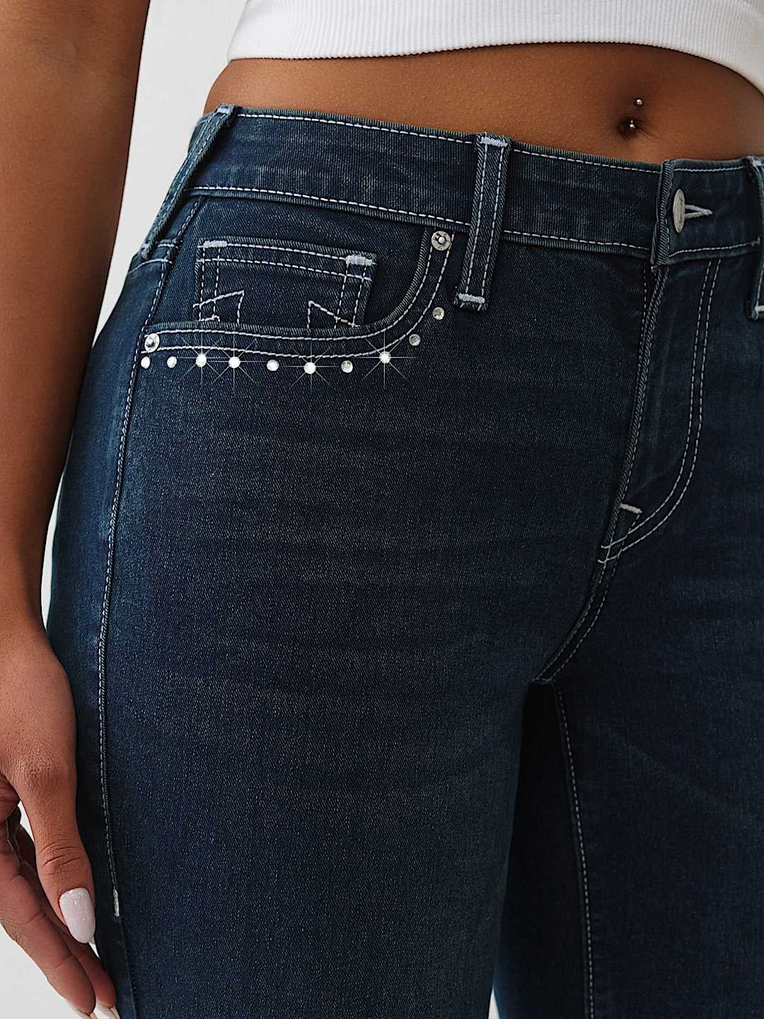 Elevate your denim collection with the True Religion Jennie Crystal Skinny jeans, featuring a sleek dark mountainside wash that effortlessly transitions from day to night. The crystal embellishments add a touch of glamour to the classic skinny silhouette, while the premium denim fabric ensures comfort and durability. Perfect for pairing with your favorite tops and accessories, these jeans deliver iconic True Religion style with modern edge. A wardrobe essential that combines sophistication with contemporary flair.