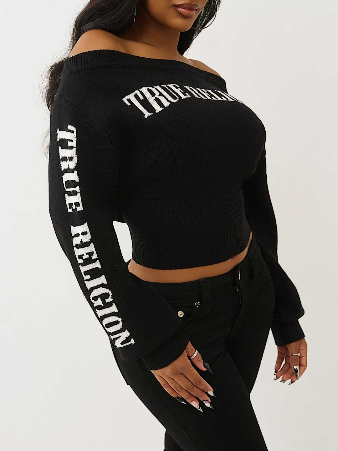 Embrace effortless style with this True Religion off-shoulder sweater in classic black. The shrunken silhouette creates a modern, fitted look that flatters while maintaining comfort. Perfect for layering or wearing solo, this versatile piece transitions seamlessly from casual days to evening outings. The off-shoulder design adds a touch of contemporary edge to your wardrobe. Crafted with quality construction, it's an essential addition to any fashion-forward collection.