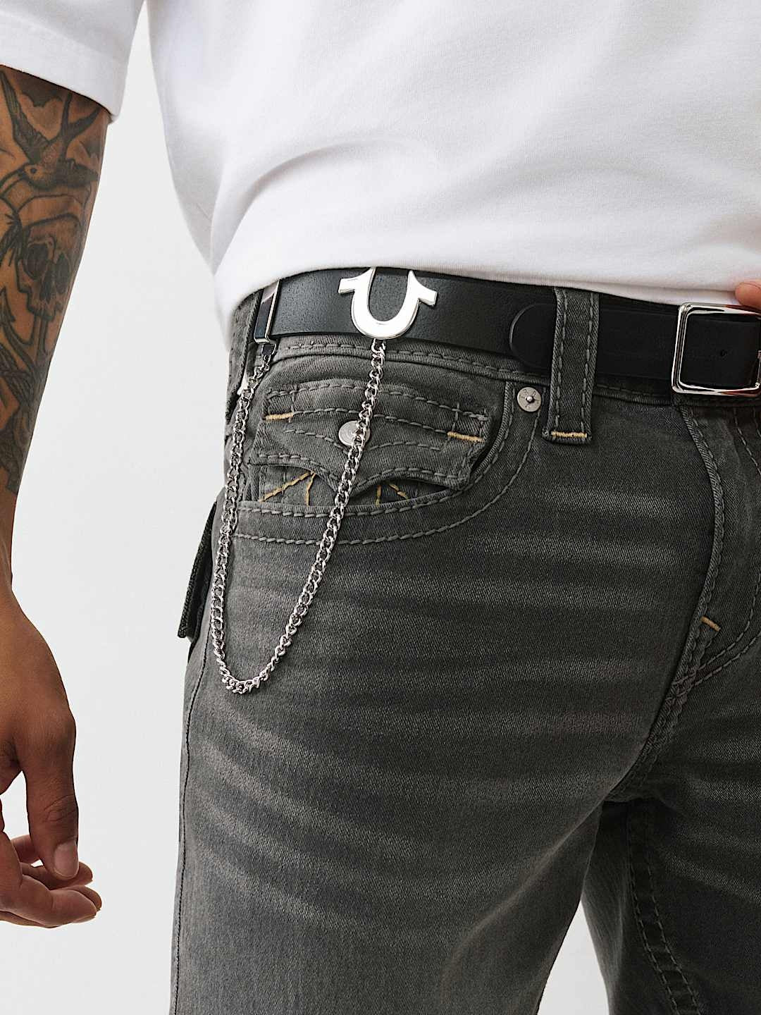 Elevate your everyday style with the True Religion HS Chain Belt in Jet Black. This striking accessory combines bold metallic chain detailing with sleek black leather, delivering instant edge to any outfit. Perfect for cinching dresses, layering over coats, or defining your waistline, this versatile belt transitions seamlessly from casual to dressed-up looks. The premium craftsmanship and iconic True Religion branding ensure you're investing in a piece that endures. Make a statement with a belt that's as confident as you are.