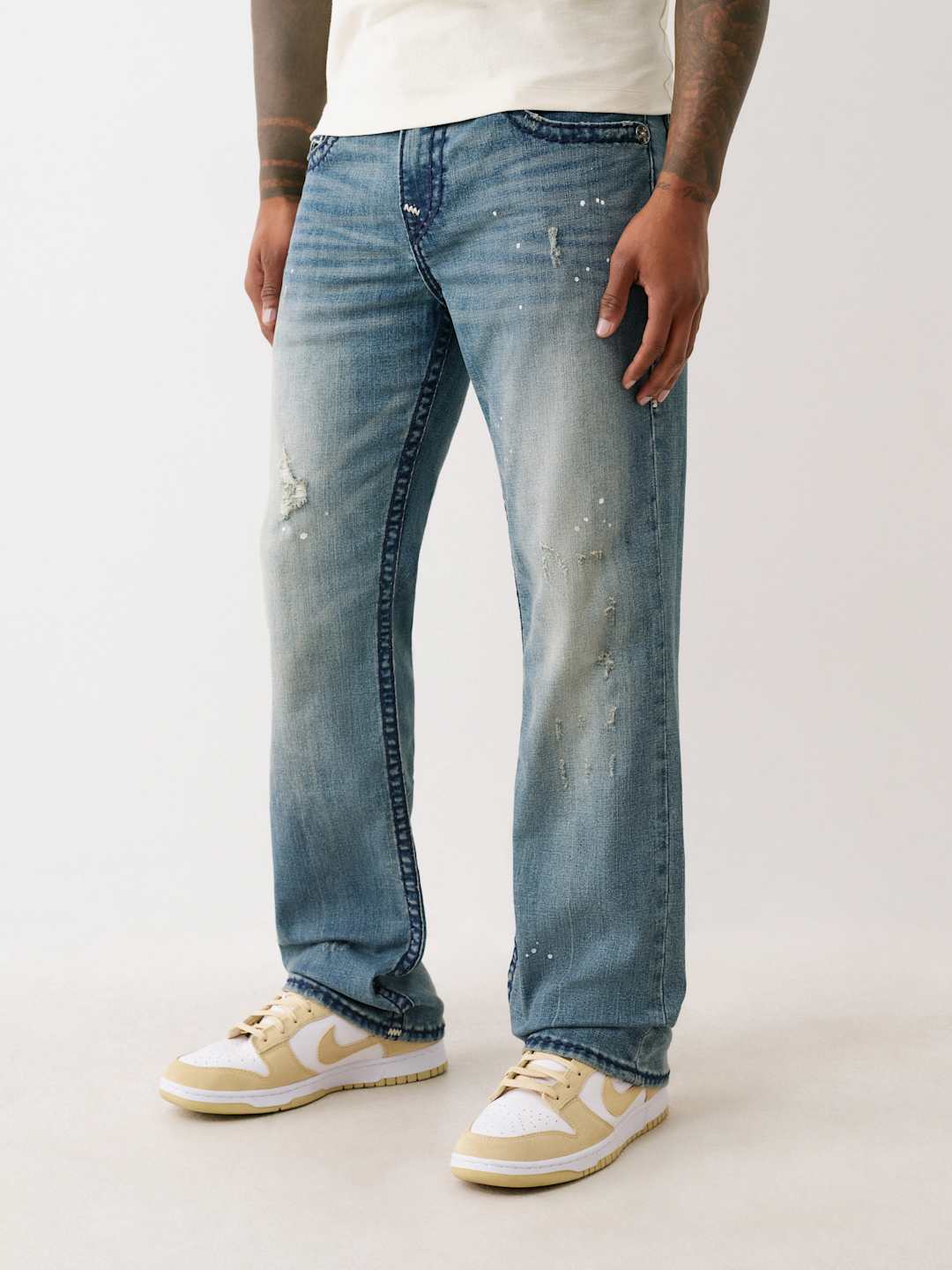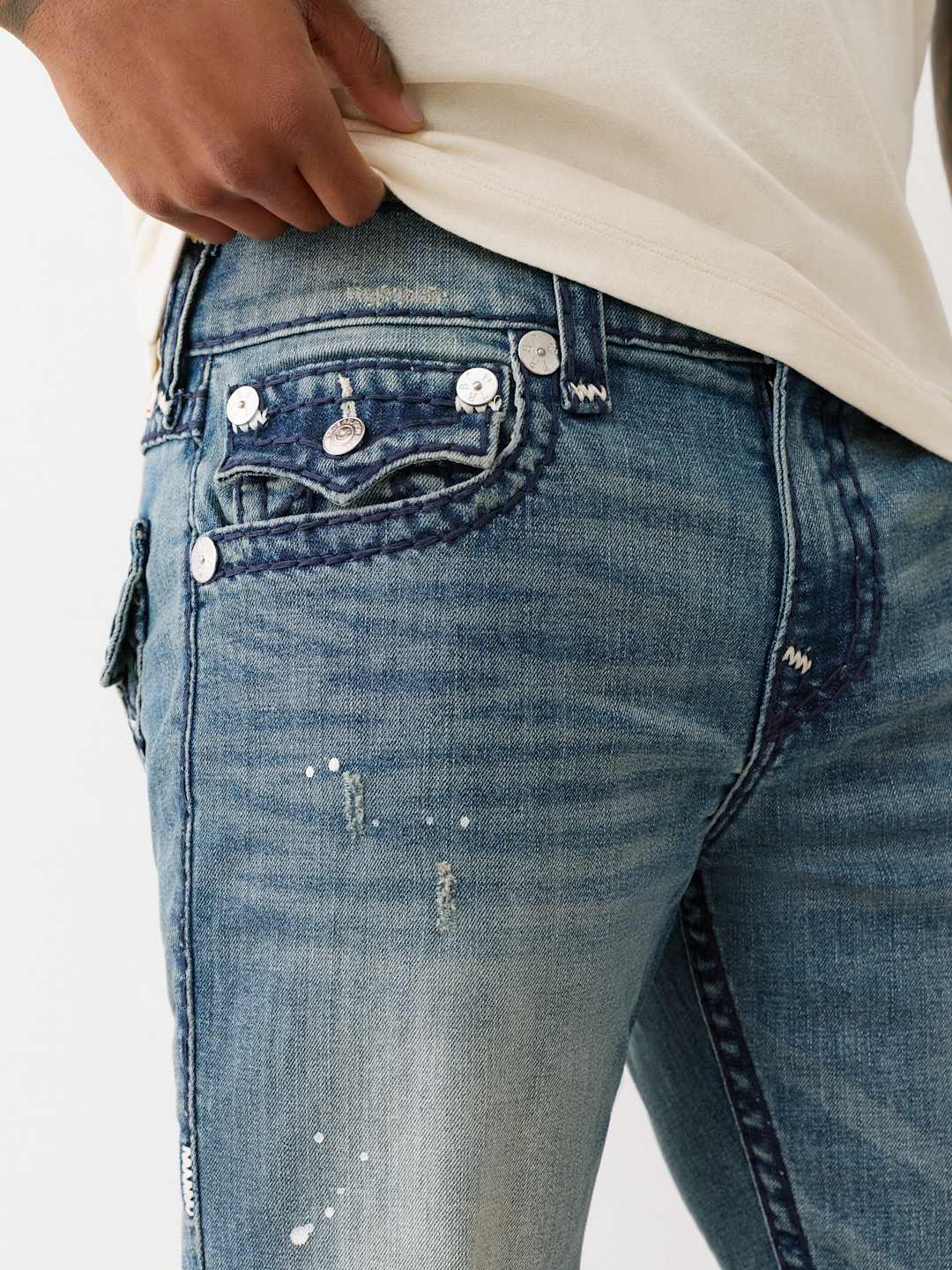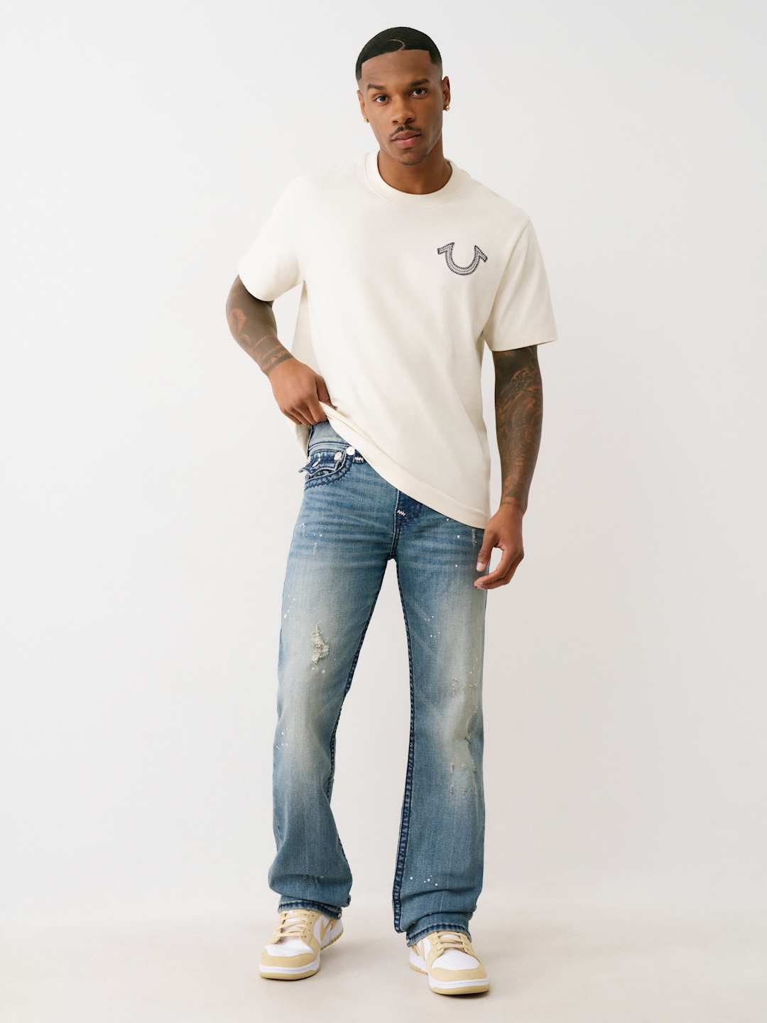 The Ricky Super T is a signature True Religion silhouette that commands attention. Cut in a medium wash with strategic rips, this 34-inch inseam delivers authentic denim character with contemporary edge. The triple-stitch detailing and flap pockets define the classic True Religion aesthetic, while the relaxed fit ensures all-day comfort. Built for those who understand that premium denim is an investment in style that transcends seasons. Elevate your rotation with a piece that balances heritage craftsmanship and modern attitude.