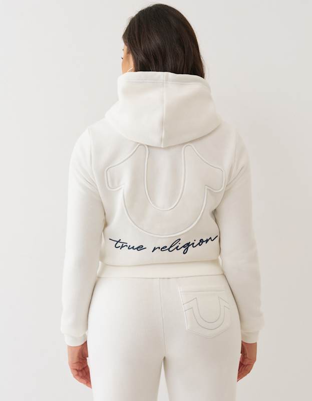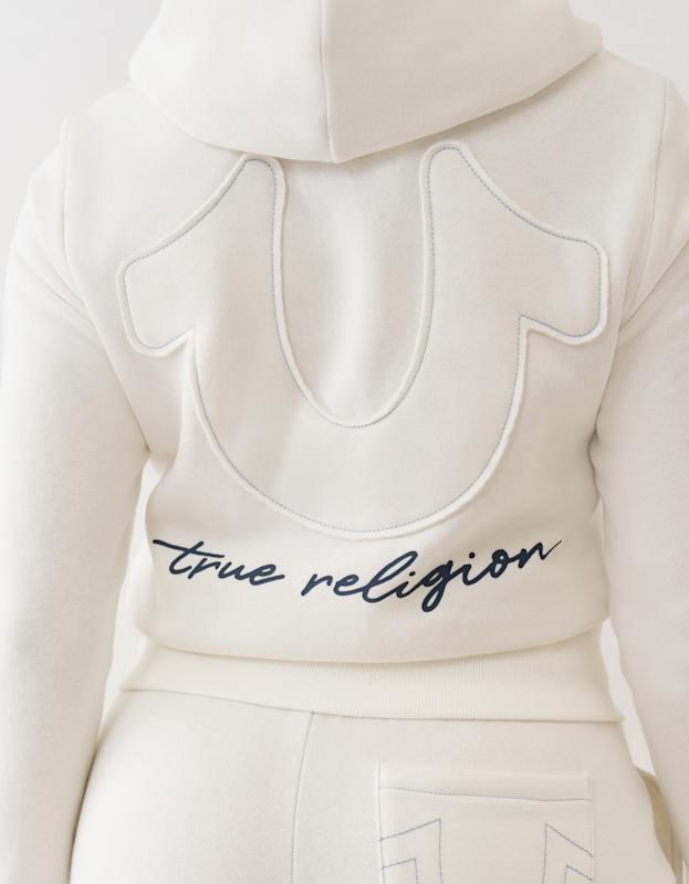 True Religion Hs Applique Zip Hoodie Winter White Elevate your casual wardrobe with this premium zip hoodie, featuring the iconic True Religion appliqué detailing that defines the brand's signature aesthetic. Crafted in crisp winter white, this versatile piece transitions seamlessly from streetwear staples to layered essentials. The structured fit and quality construction deliver both comfort and durability, while the bold appliqué adds instant visual impact to any outfit. Perfect for those who appreciate understated luxury with recognizable edge—a wardrobe investment that pairs effortlessly with denim or joggers for that coveted premium casual look.