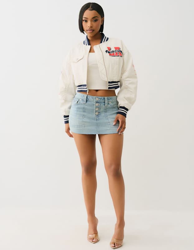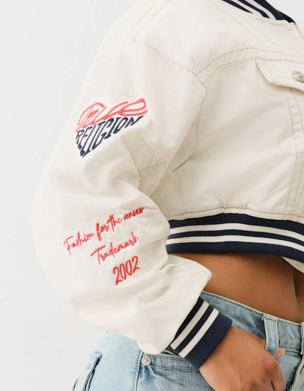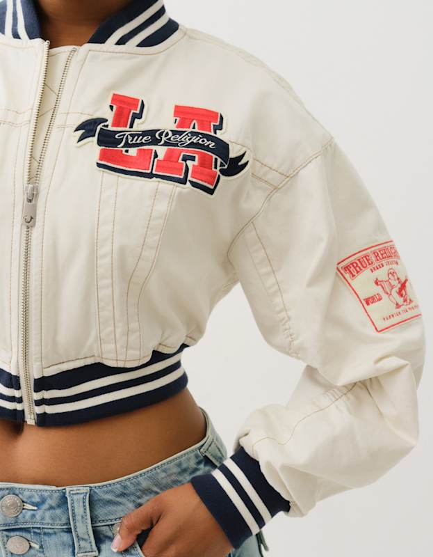 True Religion Varsity Bomber Jacket Winter White Elevate your seasonal rotation with this iconic varsity bomber in crisp winter white. Crafted with premium construction, the jacket combines classic Americana styling with contemporary edge—perfect for layering over essentials or standing alone as a statement piece. The structured silhouette and refined detailing deliver that coveted True Religion aesthetic, while the versatile colorway transitions seamlessly from casual streetwear to elevated weekend looks. Built for those who understand that quality outerwear is an investment in timeless style.