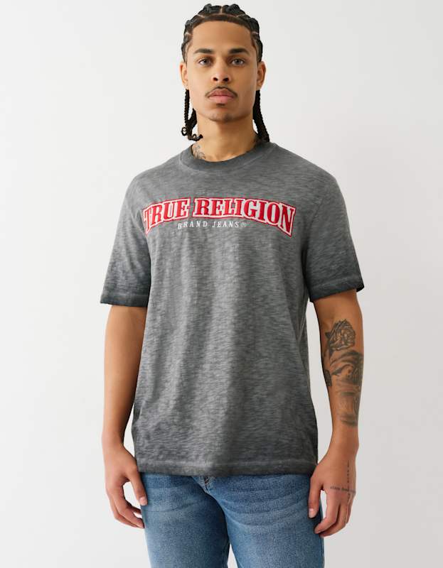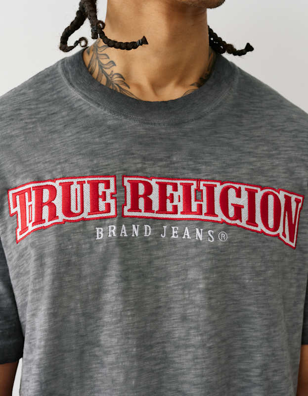 True Religion SS Embro Arch Logo Tee Jet Black Elevate your casual rotation with this iconic True Religion short-sleeve tee, featuring the brand's signature embroidered arch logo across the chest. Crafted in jet black for versatile styling, this piece delivers the premium quality and recognizable heritage that defines True Religion's aesthetic. The embroidered detailing adds dimension and authenticity, making it a standout essential that pairs effortlessly with denim or tailored pieces. Perfect for those who appreciate understated luxury and timeless streetwear appeal.