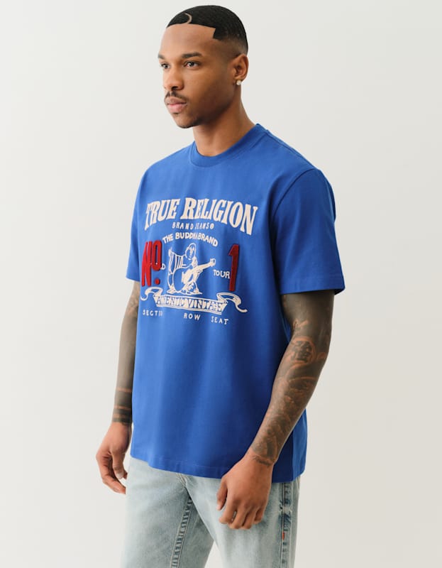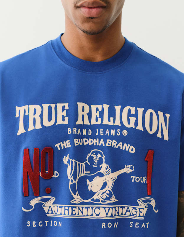 True Religion SS True Vintage No1 Tee Mazarine Blue Embrace timeless style with this iconic True Religion short-sleeve tee, rendered in a striking mazarine blue. The True Vintage No1 design channels the brand's heritage aesthetic—clean, confident, and effortlessly wearable. Perfect for layering or wearing solo, this essential piece pairs seamlessly with your favourite denim or casual bottoms. Crafted for comfort and durability, it's the foundation piece every wardrobe needs. Elevate your everyday with True Religion's signature blend of premium quality and understated sophistication.