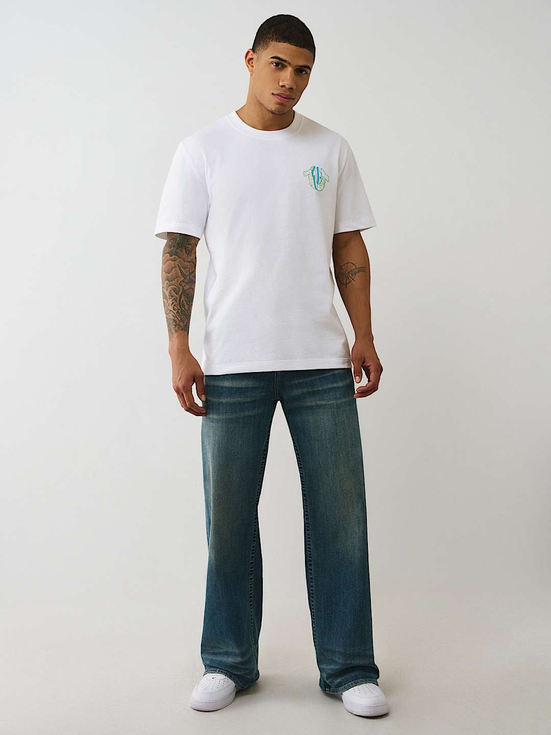 Designed with attention to detail, the True Religion branding adds a subtle yet distinctive touch, making this t-shirt stand out without overpowering your look. The classic crew neck and short sleeves ensure a timeless silhouette that suits any occasion, from relaxed weekends to casual outings. Whether you’re dressing up or down, this t-shirt brings a modern edge while maintaining everyday comfort.