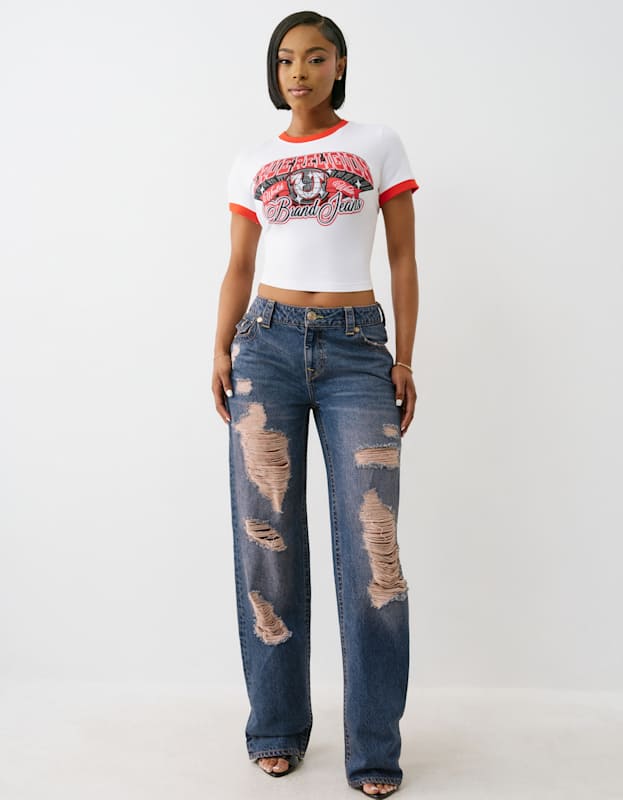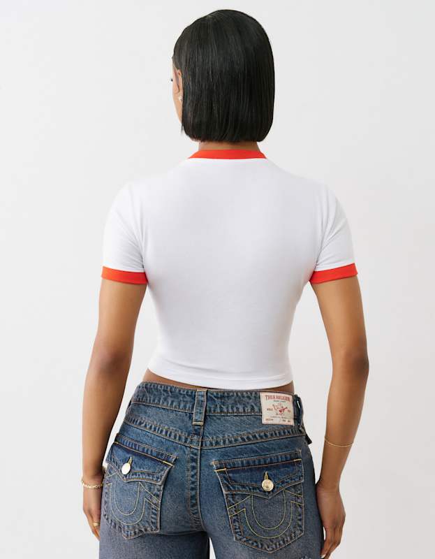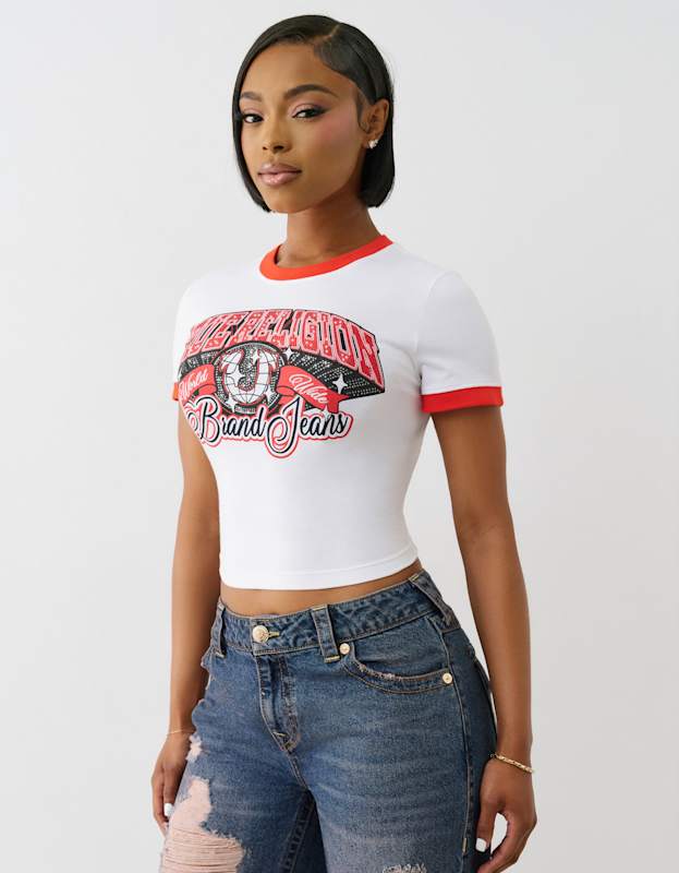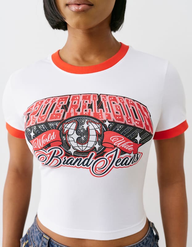 Elevate your wardrobe with our True Religion Crystal Contrast Ringer Tee. The iconic fit and red contrast neck and sleeves add a touch of personality to this classic white tee. Finished with sparkling crystal detailing, this tee is sure to inspire with its unique and stylish design.