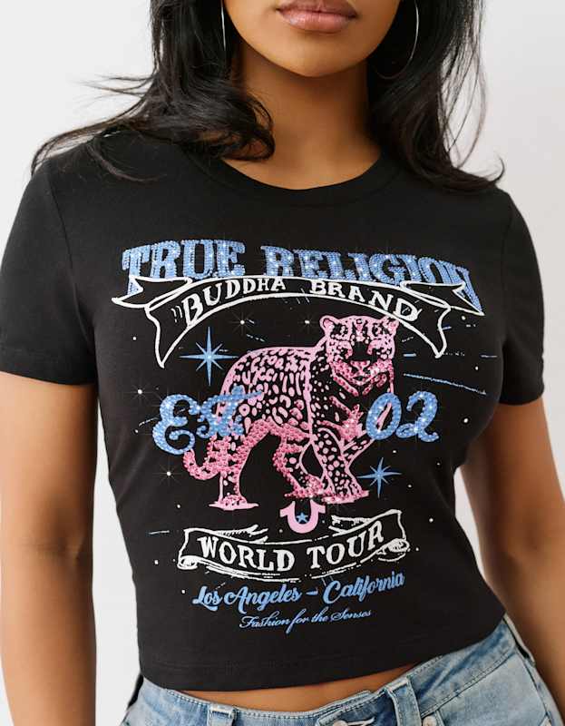 Elevate your style with our True Religion Crystal Leopard Baby Tee in Jet Black. The intricate leopard crystal design adds a touch of elegance to this classic tee. Made with high-quality materials, this tee offers both comfort and fashion. Perfect for any occasion, add this must-have piece to your wardrobe today!