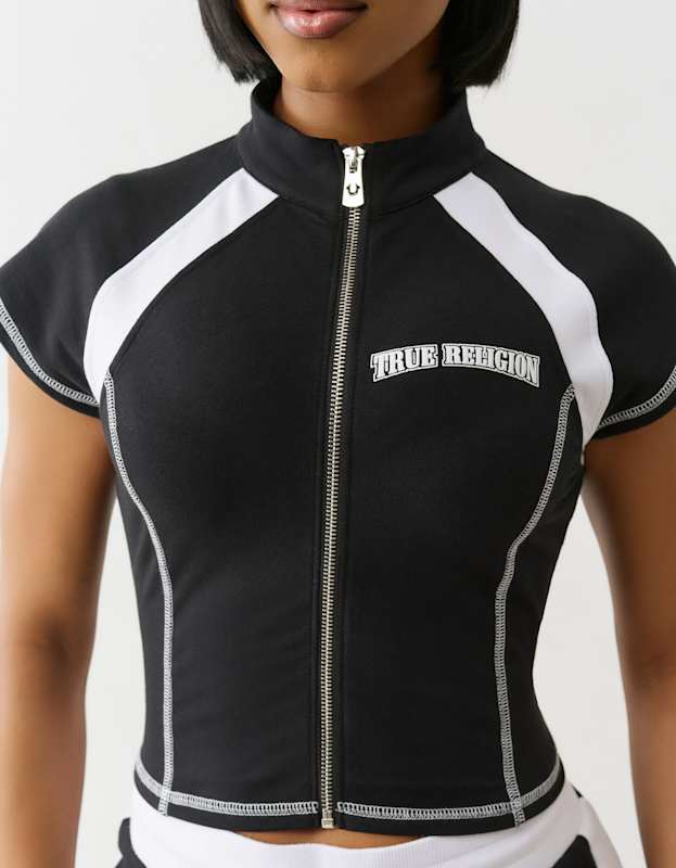 Elevate your casual wardrobe with this True Religion French Terry Short Sleeve Zip-Up Jacket in striking black and white. Crafted from premium French terry fabric, it delivers comfort and style in equal measure. The classic colorblock design pairs effortlessly with your everyday essentials, while the zip-up silhouette offers versatile layering options. Perfect for transitional seasons or as a statement piece over basics, this jacket combines True Religion's signature quality with contemporary streetwear appeal. A wardrobe staple that works as hard as you do.