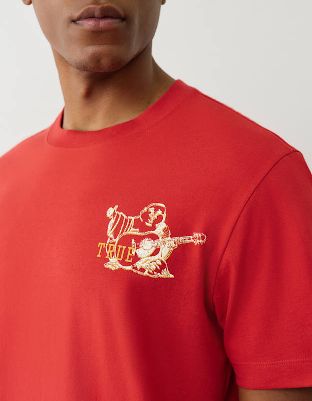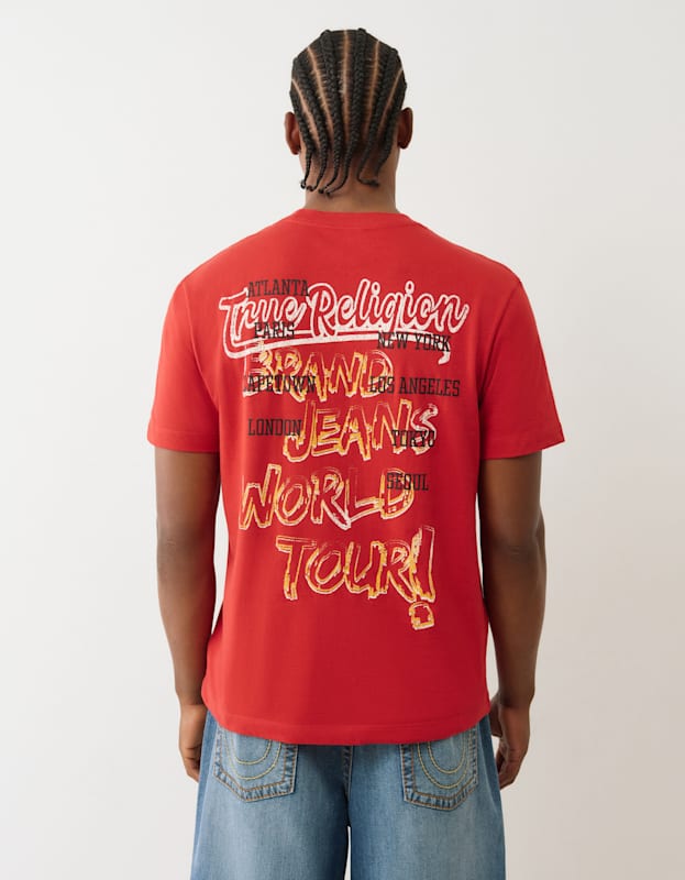 True Religion's signature crinkle paint tee delivers effortless edge with artistic texture and bold crimson hue. Crafted from premium cotton, this short-sleeve essential features the iconic True Religion branding and a distinctly distressed finish that sets it apart from everyday basics. Perfect for layering or wearing solo, it pairs seamlessly with denim or tailored pieces for a versatile look that bridges casual and refined. A statement piece that captures the brand's rebellious spirit while maintaining wearable sophistication.