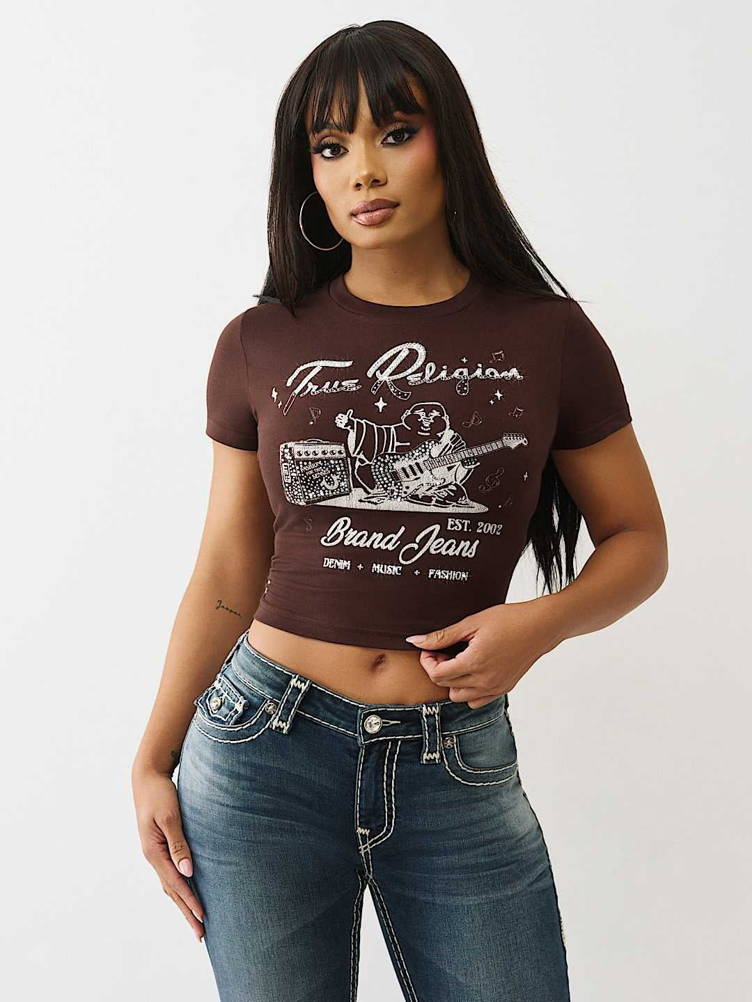 Embrace spiritual style with this True Religion Crystal Buddha short-sleeve tee. Crafted in a warm chicory coffee tone, this classic baby fit features an iconic crystal-embellished Buddha design that adds an effortless touch of zen-inspired fashion. Perfect for layering or wearing solo, this versatile piece combines True Religion's signature quality with timeless appeal. A wardrobe essential that blends comfort, style, and meaningful symbolism.