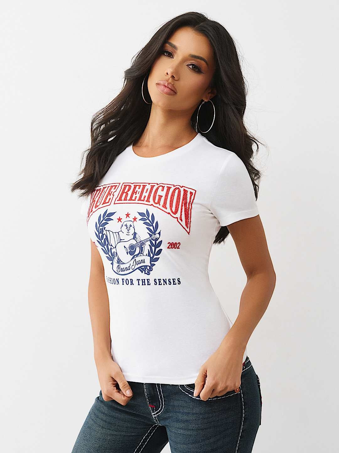 Embrace spiritual style with the True Religion Crystal Buddha Short Sleeve T-Shirt in crisp Optic White. This classic tee features an iconic crystal-embellished Buddha design that adds a touch of zen-inspired elegance to your everyday wardrobe. Crafted from quality fabric, it delivers comfort and durability for versatile wear. Perfect for layering or wearing solo, this statement piece combines True Religion's signature aesthetic with timeless appeal. Elevate your casual collection with this distinctive tee that blends fashion and mindfulness.