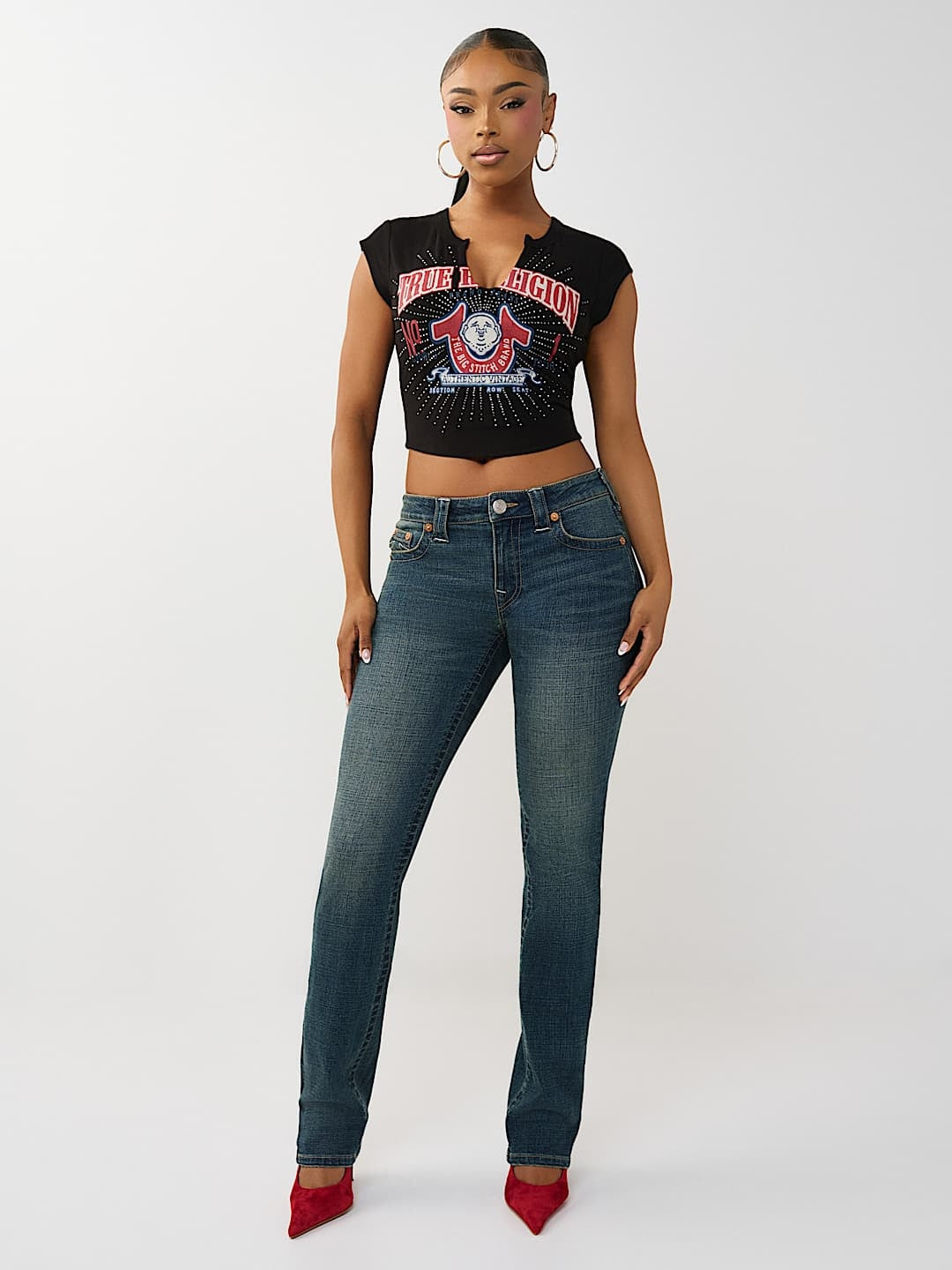 Embrace iconic style with this True Religion T-Shirt featuring a distressed Buddha graphic design. The classic V-notch neckline and short sleeves deliver timeless appeal, while the jet black fabric provides versatile everyday wear. Crafted with the quality True Religion is known for, this tee combines spiritual imagery with contemporary streetwear aesthetics. Perfect for layering or wearing solo, it's an essential addition to any casual wardrobe.