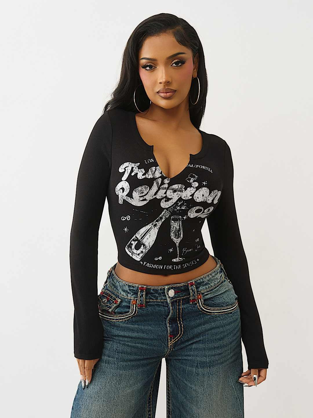 True Religion T-Shirt Glitter Ribbed Notch Ls Jet Black