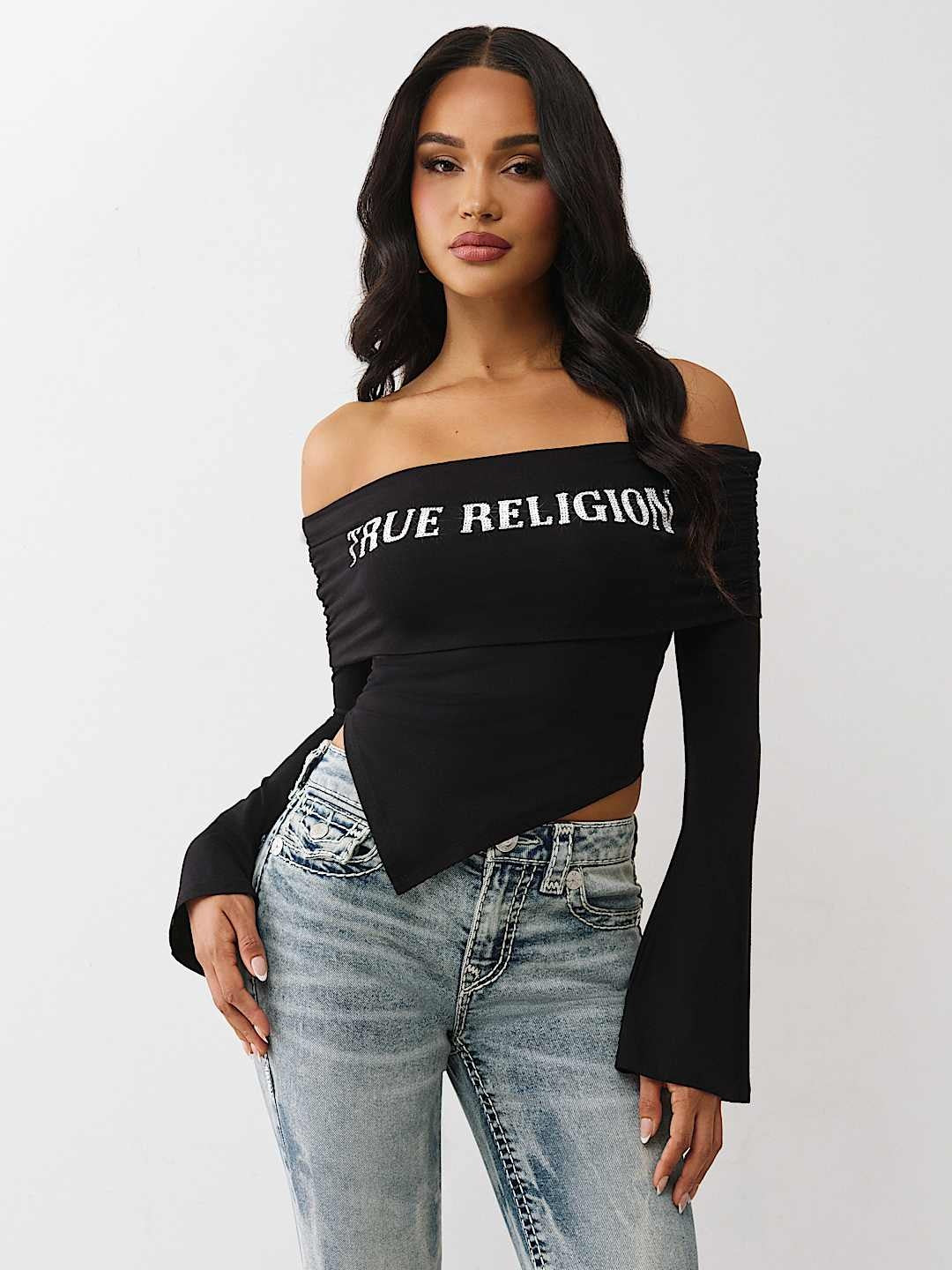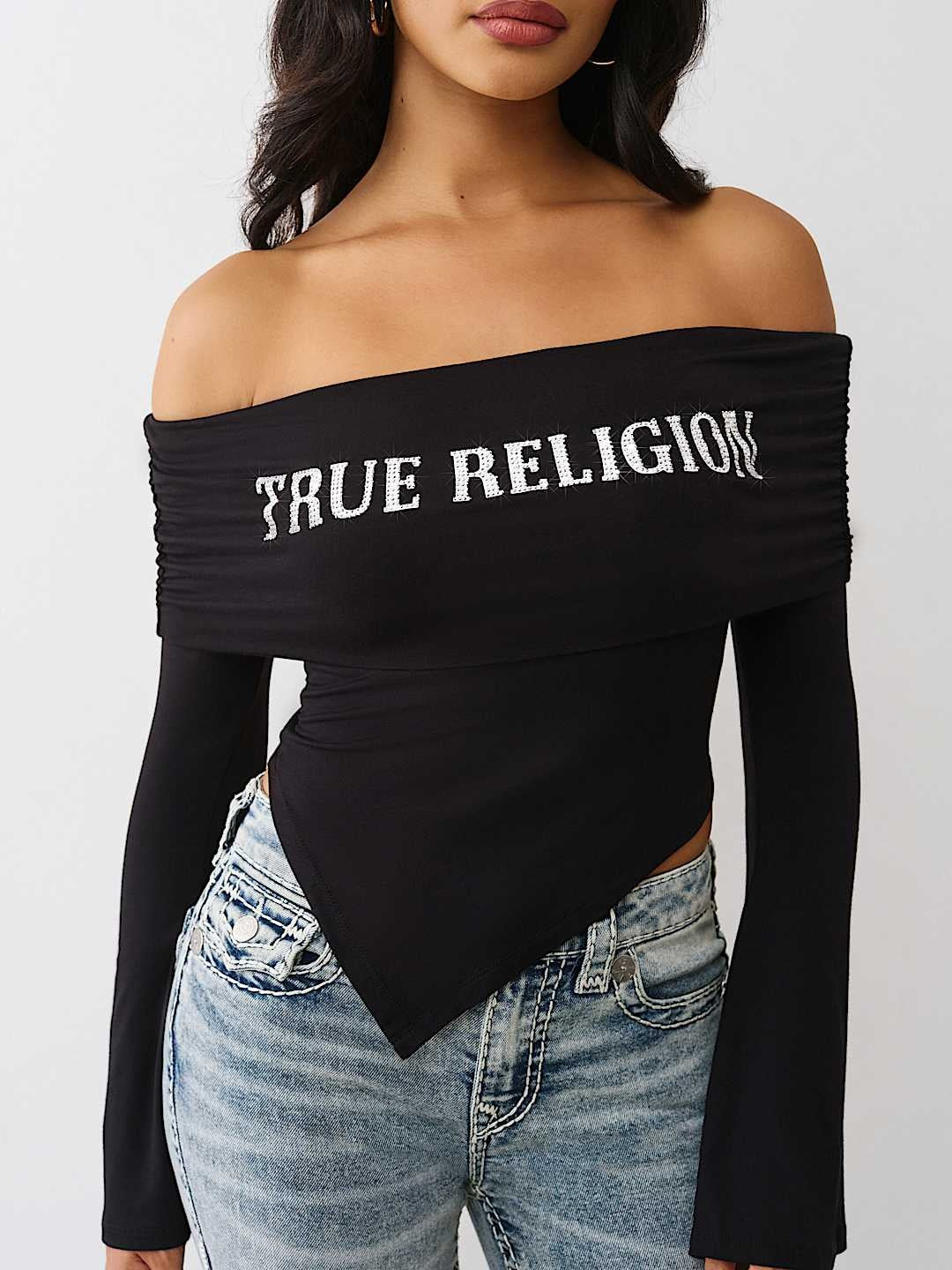 True Religion T-Shirt Printed Crystal Asym Off Shoulder Jet Black