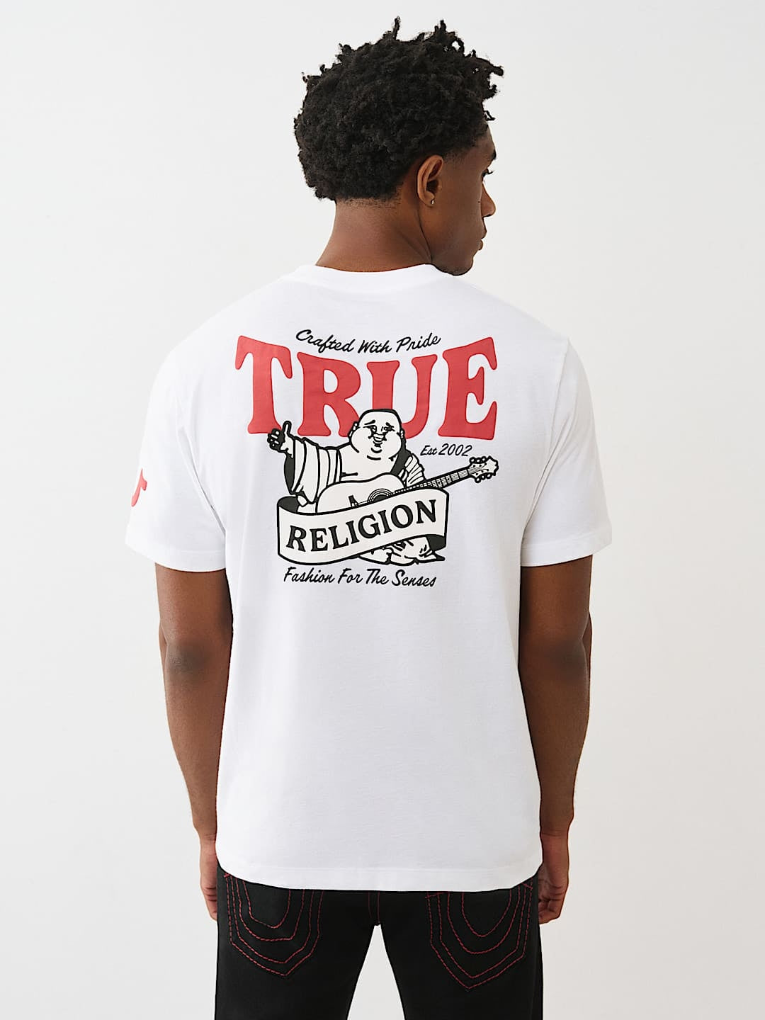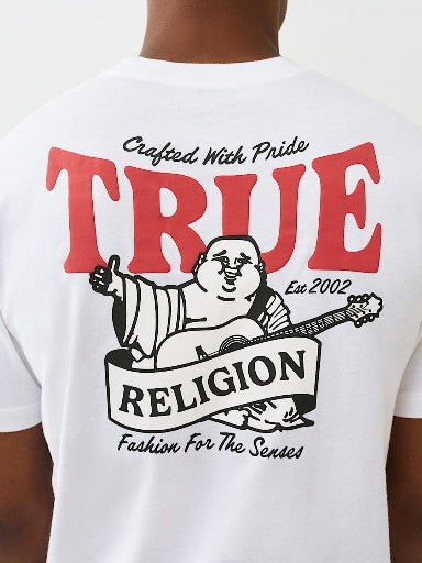 Featuring the iconic True Religion Warped True Buddha graphic, this t-shirt brings a unique edge to your casual wear. The detailed design reflects a bold, artistic vibe that stands out without overwhelming your overall look. Whether you're heading out for a casual hangout or running errands, this t-shirt ensures you stay effortlessly stylish.