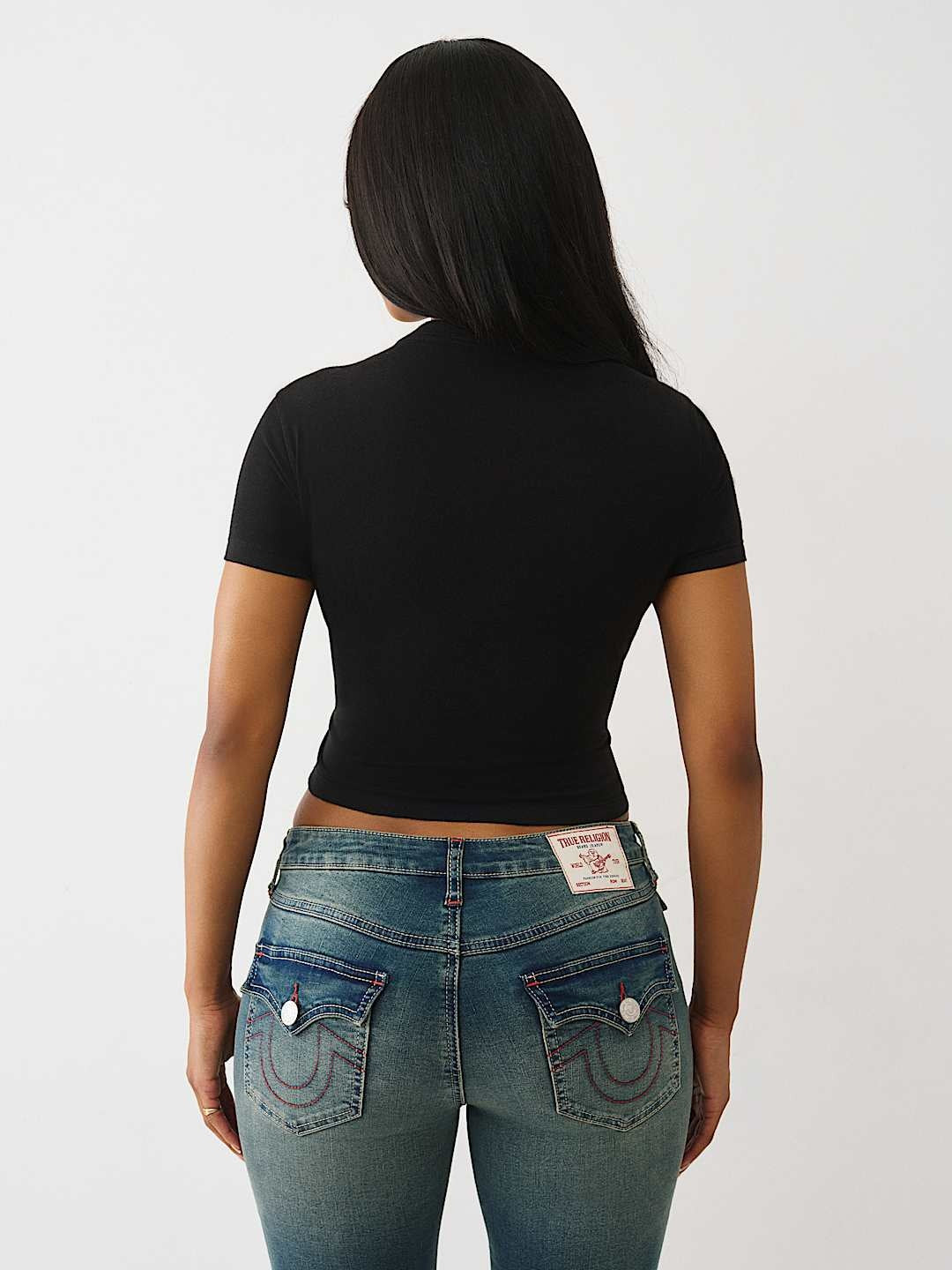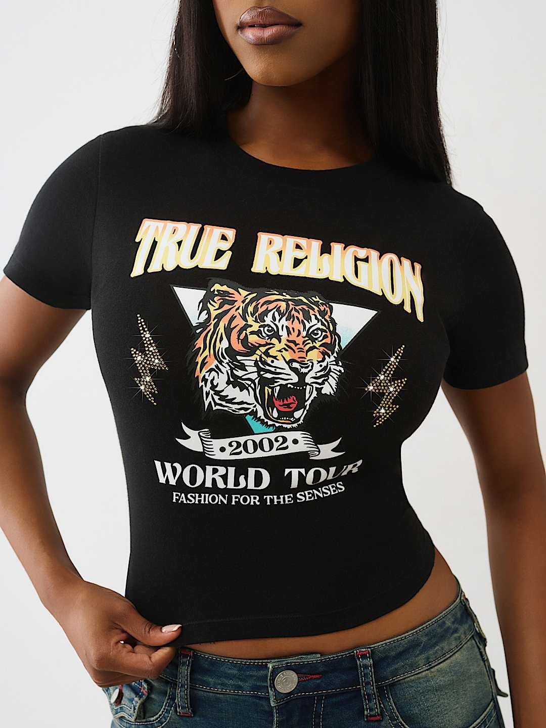Introducing the True Religion TR Tiger Baby Tee in Jet Black—a bold statement piece that combines iconic branding with contemporary style. This fitted baby tee features the signature TR tiger graphic, delivering instant edge and attitude to your everyday wardrobe. Crafted for those who embrace confident self-expression, the sleek jet black colorway pairs effortlessly with everything from tailored trousers to vintage denim. Perfect for layering or wearing solo, this essential tee transforms any outfit into a fashion moment. Elevate your basics with True Religion's unmistakable heritage and undeniable cool factor.