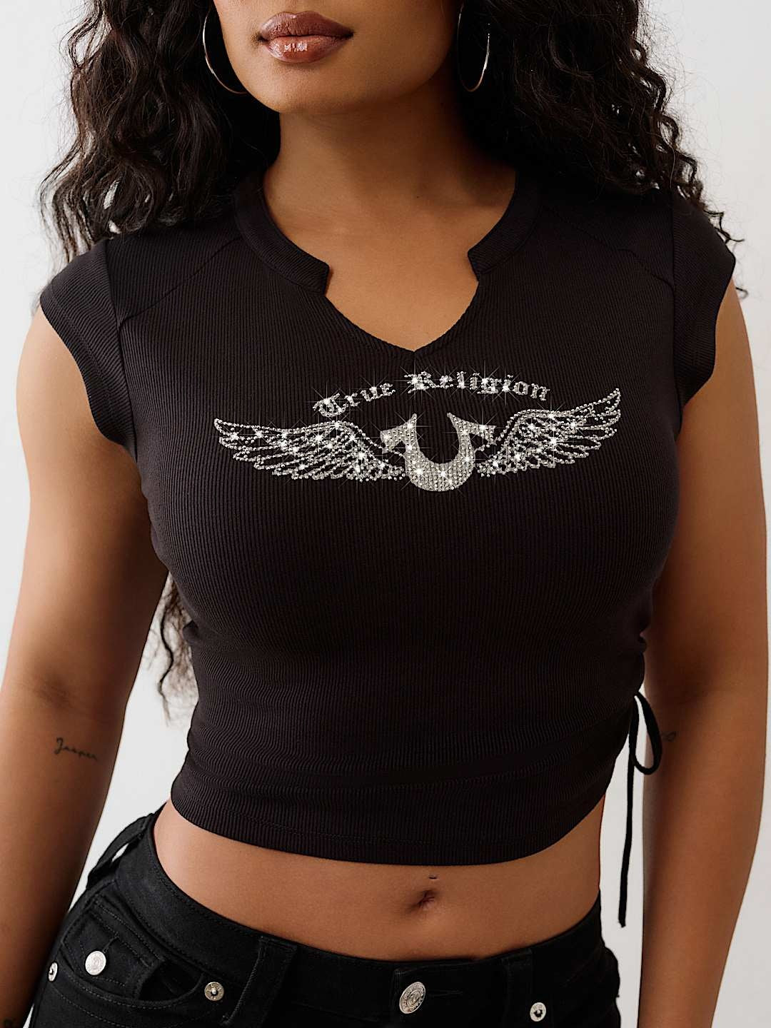 True Religion Crystal V Notch Side Ruch Top Jet Black