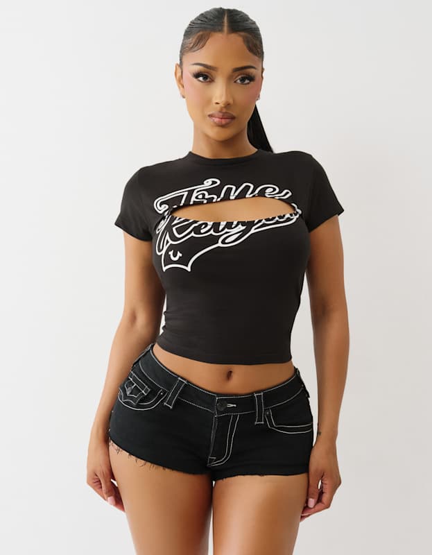 True Religion Sporty Front Cut Out Top – Jet Black Elevate your casual wardrobe with this striking front cut-out top from True Religion. Crafted in sleek jet black, it combines contemporary edge with effortless sophistication. The strategic cut-out detail adds visual interest and modern flair, making it perfect for layering or wearing solo. Designed for comfort and style, this piece transitions seamlessly from day to night, delivering that premium streetwear aesthetic True Religion is known for. A versatile essential that commands attention.