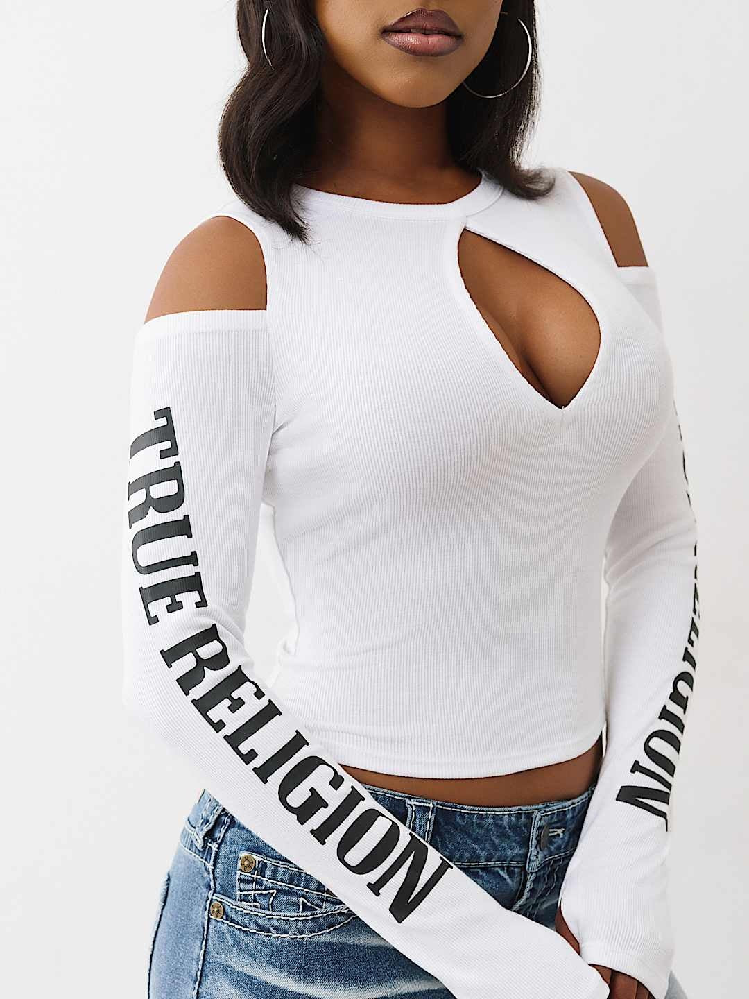 True Religion Top Branded Rib Cut Out Long Slvs White